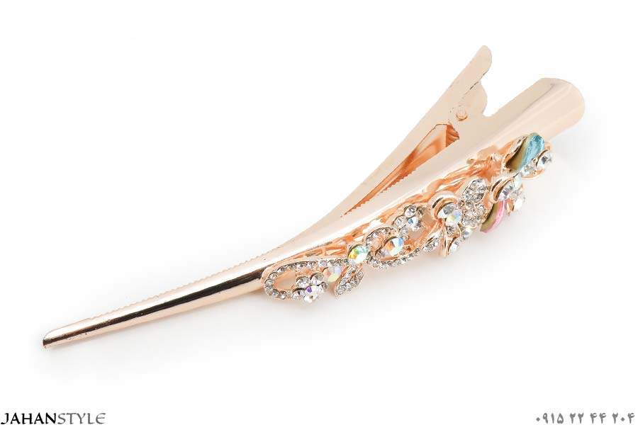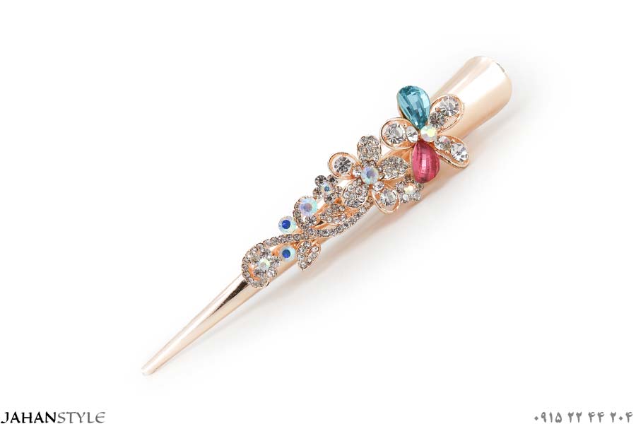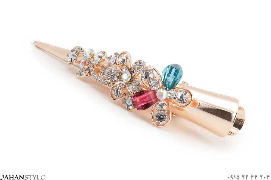 این گیره انبری طرح گل پنج پر میباشد. نگین های اشک سرخ و آبی رنگ بر روی این محصول جلوه ی زیبایی را به ارمغان آورده است.