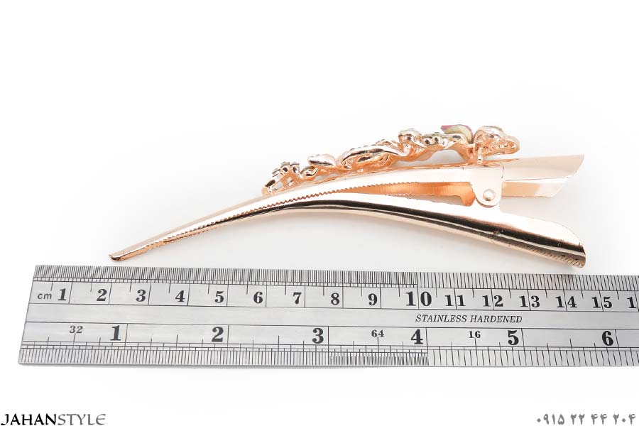 این گل سر فلزی (رزگلد) با نگین های شیشه ای هفت رنگ و سفید تزئین شده است.