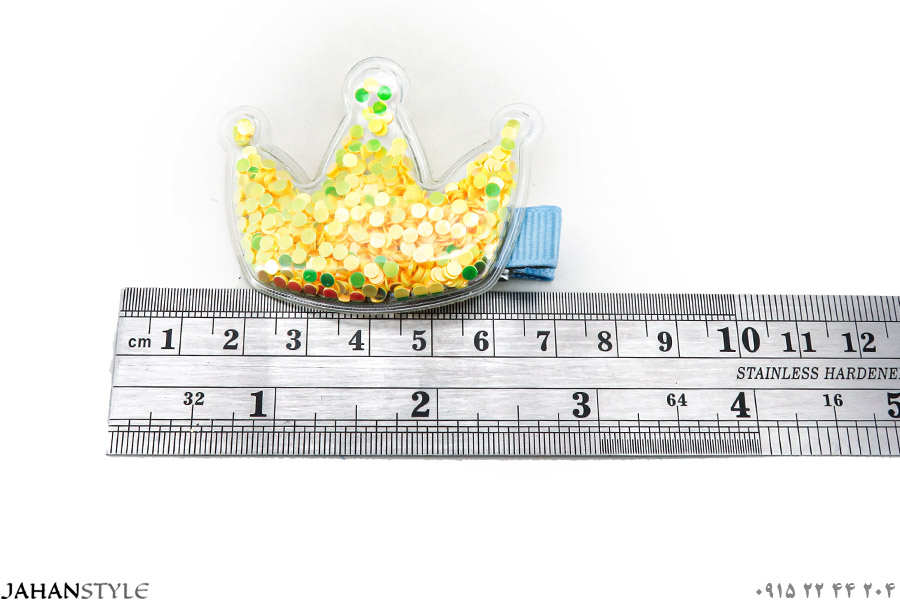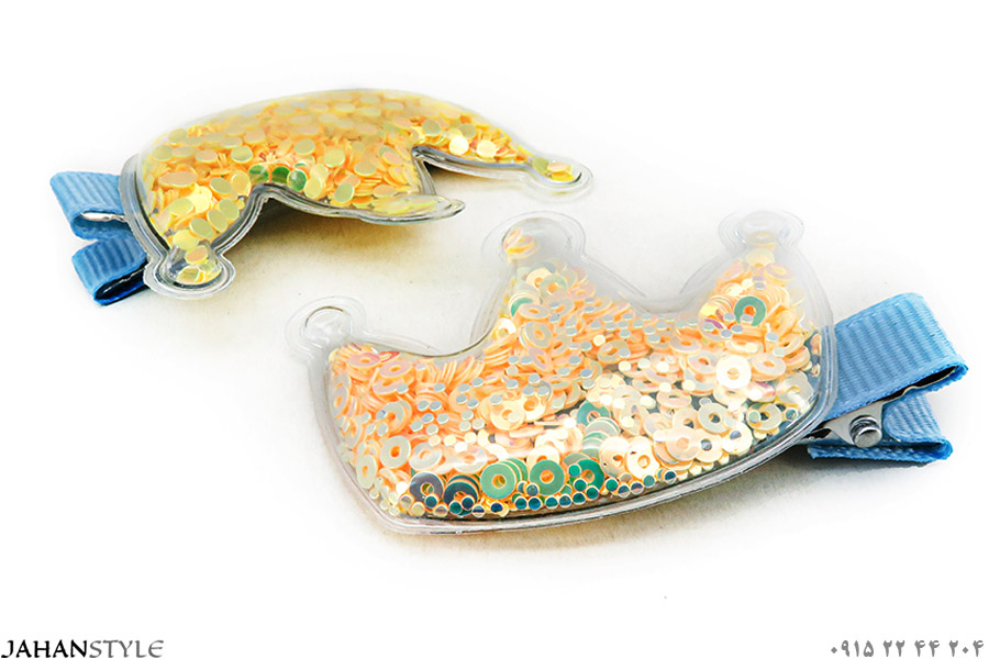 این گل سر طرح تاج مدل آکواریومی و از جنس pvc بوده و داخل آن پر از پولکهای ریز زرد و طلایی است. گیره انبری از جنس فلز است که با ربان آبی پوشیده شده است.