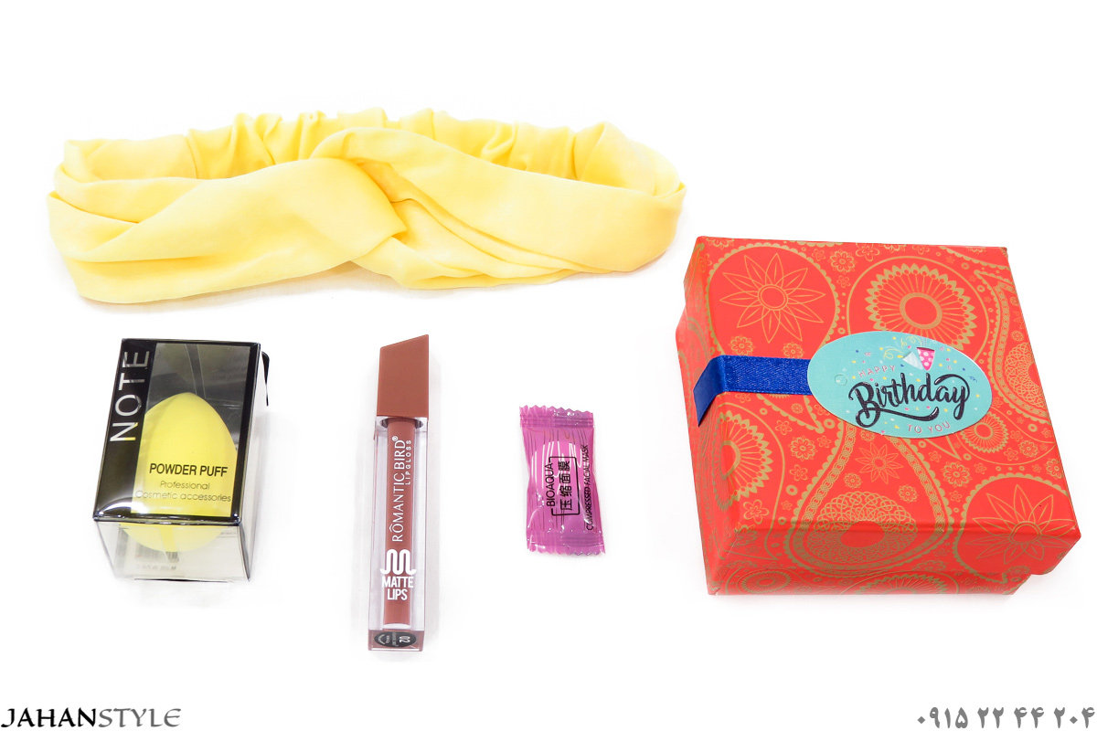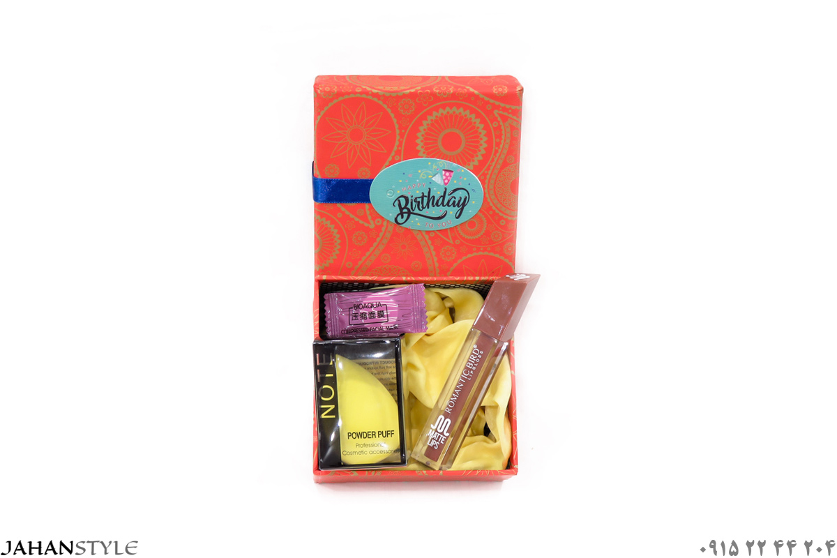 این محصولات داخل یک جعبه در ابعاد تقریبی 11*11*5 سانتی متر قرار دارند. جنس این جعبه بسیار محکم است، به عبارتی به این نوع جعبهها هارد باکس گفته میشود. جعبه به رنگ نارنجی است و روی آن طرحی از گلهای طلایی دیده میشود. برای زیباتر شدن جعبه، روی درب آن یک رمان آبی به همراه یک گیفت “تولدت مبارک” قرار گرفته است.